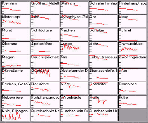 Az auraképen – a szívcsakra tájékán (tüdő, thymus, szív) – forró, agresszív vörös energiafelhők gyülekeznek a tüdő területén, annak életenergiáját gyengítve. A forróság a Tűz elemhez tartozik, amely esetünkben a tüdő területén gyűlik össze, és okozhat zavarokat. A forróság gyulladásokhoz vezethet. A gyulladások a sejt szekréció növekedéséhez vezetnek. A tüdőnél a gyulladásra való hajlam – fizikai síkon – váladék felgyülemlésére, nehéz légzésre, és bronchitisre is utalhat. Energetikai síkon a következő képet kapjuk. Az agresszív energia (vörös), mellyel a személy kívülről konfrontálódik, kibillenti őt egyensúlyából, és egyre több energiát szív el a tüdő területről. Ezért a személy kiszolgáltatottnak, nyugtalannak, magára hagyottnak érzi magát, mely állapotot a megváltozott kapkodó, ideges légzés jelez. Miután a tüdő és a vastagbél hasonló energetikai viselkedési minta szerint reagálnak, feltételezhetjük, hogy a vastagbél érintettsége is jelentkezik. Ezek a zónák a dühre és méregre gyakran hasonló mértékben érzékenyek, és ezért hajlamosak a krónikus instabilitásra.Most vizsgáljuk meg az emésztés területét: a gyomor (Magen) a plusz/mínusz 20%-os sávban helyezkedik el, idegesen reagál, de nem olyan instabil, mint a tüdő és a harántvastagbél energiazónái. Úgy tűnik, hogy ezen a területen krónikus kifáradás uralkodik. Ez megmutatkozik a sötét szürkéskék energiaszínben. A máj (Leber) reflexzóna energiája ezzel szemben 100%-on van majd lassan 60%-ra esik vissza. A gyomor és a máj nem a zöld harmónia sávban helyezkedik el, a szervek kibillentek egyensúlyi állapotukból, és megszűnt közöttük a harmonikus kommunikáció. A máj energiája nagyon magas, és blokkolt. Ezt az aurában a fehér, lila szín megjelenése jelzi. Ezzel szemben a gyomor reflexzóna nagyon gyenge, mely a sötétkékes-szürke színben mutatkozik meg. Fizikai síkon a rezgések ilyen mértékű eltérése emésztési zavarokat okoz. “Elönti az epe”. Köztudomású, hogy az érzelmi állapot “düh” a Máj-meridián chi energiáját csökkenti. A gyomor túl kevés energiával, ezáltal túlságosan kevés emésztő tűzzel rendelkezik, ezért ezt a dühöt nem tudja feldolgozni. Valószínűleg az érintett személy már hosszú ideje “nyeli” bosszúságát és dühét, ezért mostanra teljesen kimerült.